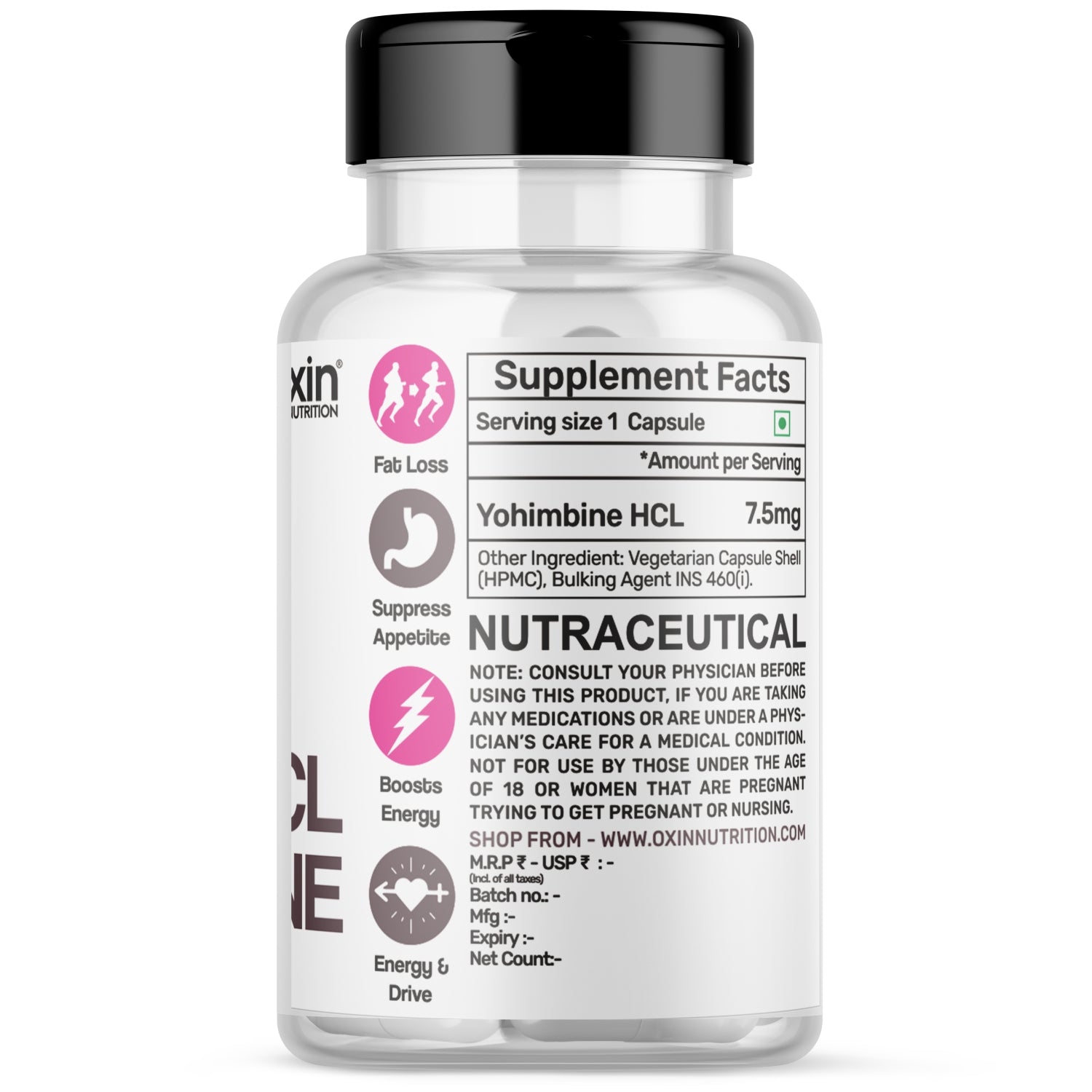 Oxin Nutrition Yohimbine HCL each capsule provides 10 mg of pure Yohimbine HCL (Pharmaceutical & USP Grade) which is one of the best fat loss supplement that are proven to accelerate fat burning, it can speed up your metabolism, improve your workout performance, and help you lose stubborn fat faster. Oxin Nutrition Yohimbine’s main property of interest for stubborn fat burning is that it’s an alpha-2-receptor antagonist. Fat cells have different receptors that control it. Oxin Nutrition Yohimbine is an alpha-2-receptor antagonist (a2-blocker), which causes your body to increase noradrenaline production. it activates the sympathetic ‘fight-or-flight’ nervous system and increases your energy expenditure, Yohimbine affects different receptors, which gives yohimbine a few unique properties. Oxin Nutrition Yohimbine HCL is in its purest form and derived from vegetarian source and well tested in lab for purity and potency.