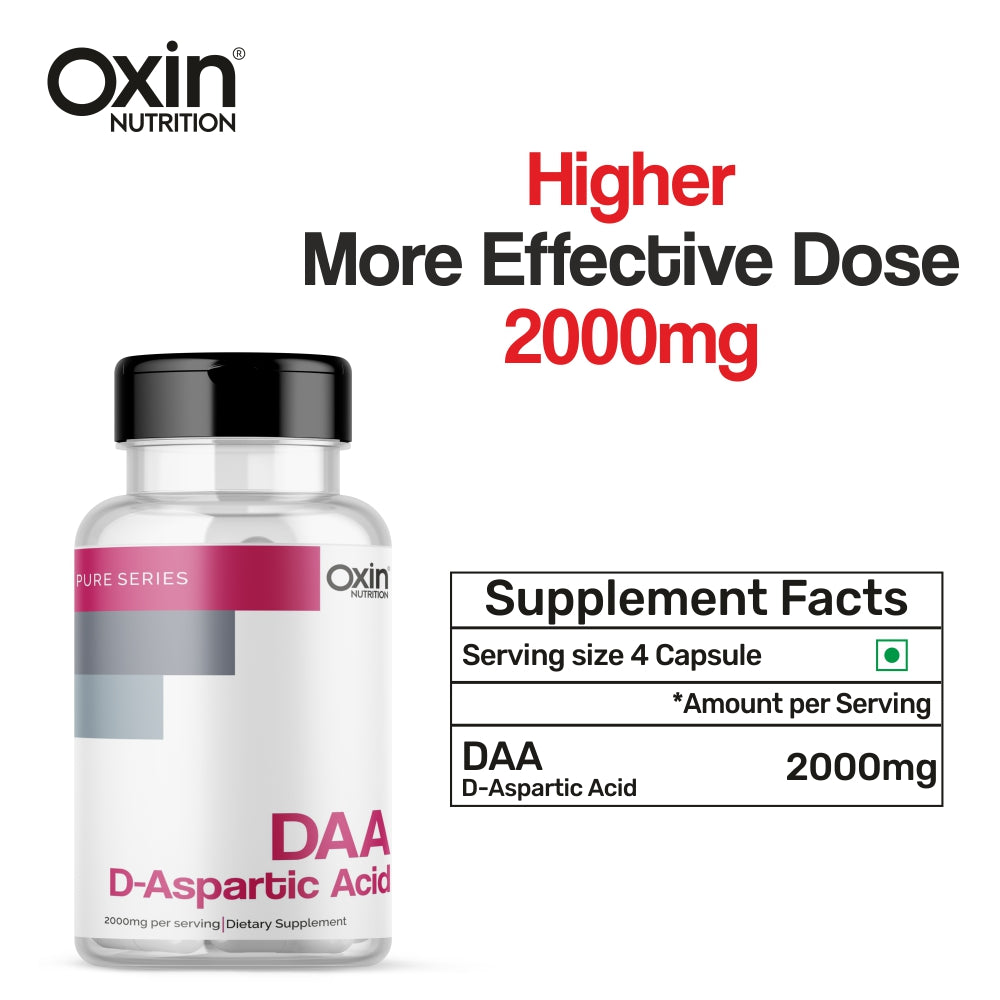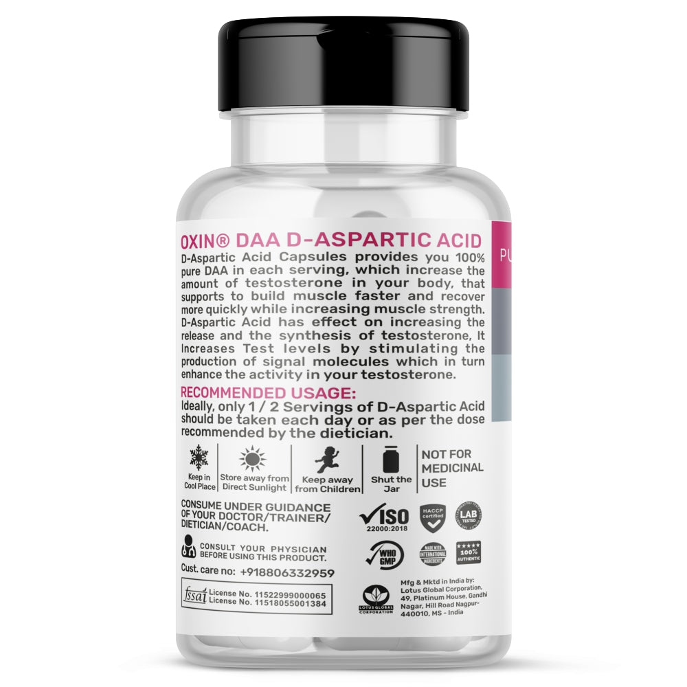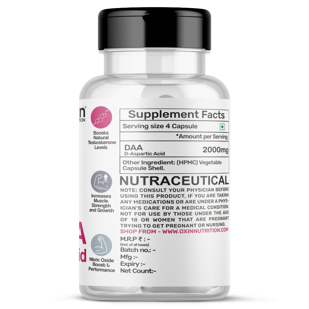 THE D-Aspartic Acid: Oxin Nutrition D-Aspartic Acid Capsules provides you 100% pure D Aspartic Acid in each serving, which increases the amount of testosterone in your body, that supports to build muscle faster and recover more quickly while increasing muscle strength. Oxin Nutrition D-Aspartic Acid has effect on increasing the release and the synthesis of testosterone It Increases Test levels by stimulating the production of signal molecules which in turn enhance the activity in your testosterone.