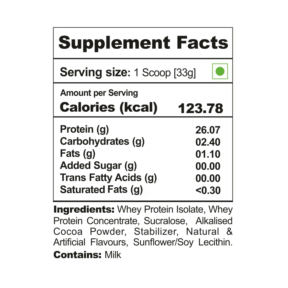 INGREDIENTS: Cross-Flow Micro filtrated Whey Protein Isolate, Cross-Flow Micro filtrated Whey Protein Concentrate, Cocoa (Processed with Alkali), Sucralose, Natural & Artificial Flavours