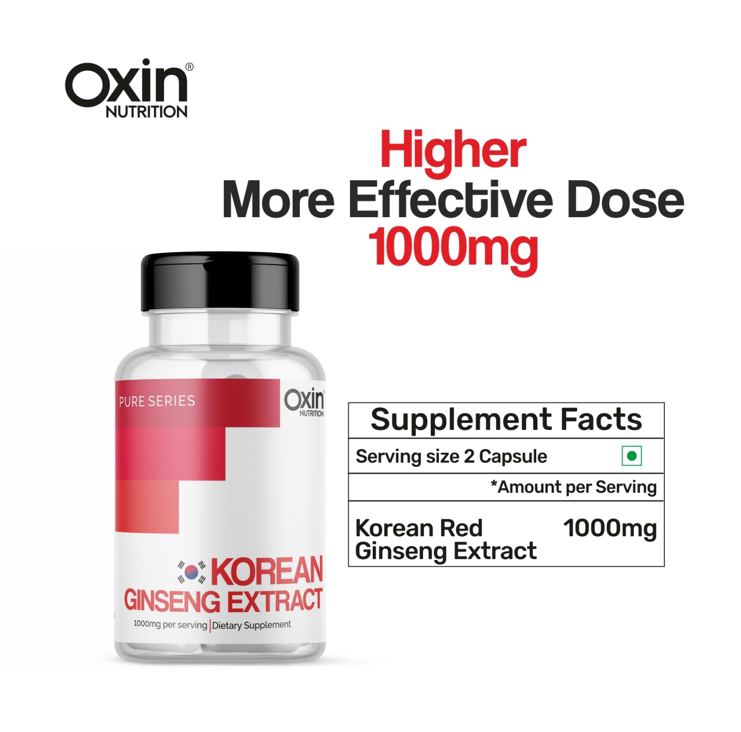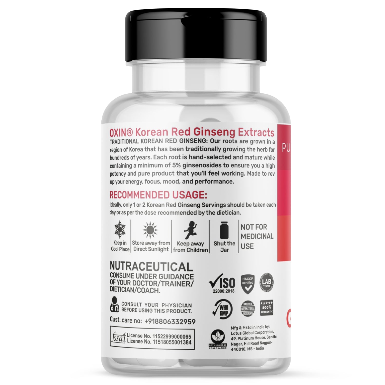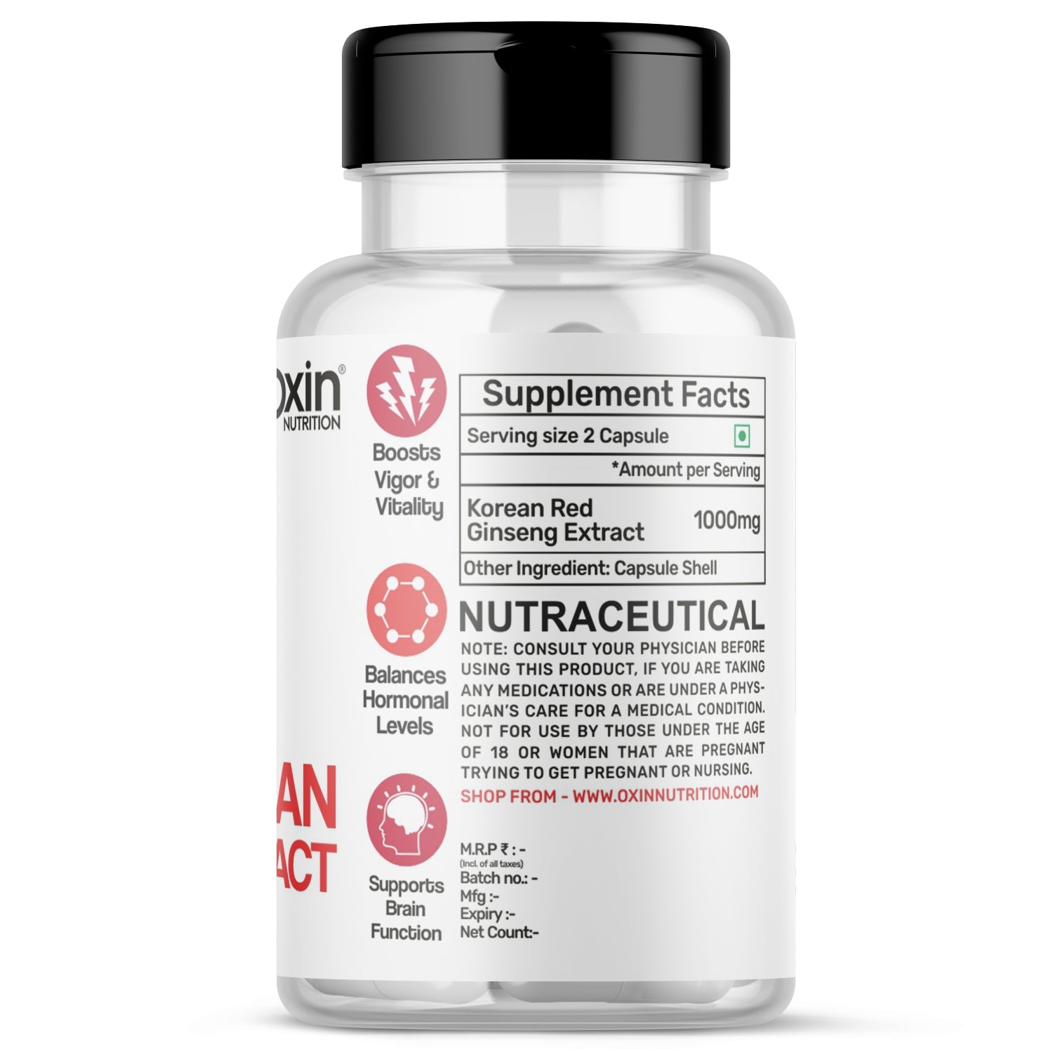 • ZERO SIDE EFFECTS: Oxin Nutrition Korean Red Ginseng Capsule is 100% plant based supplement. It contains no additives, preservatives or harmful chemicals unlike other supplements.