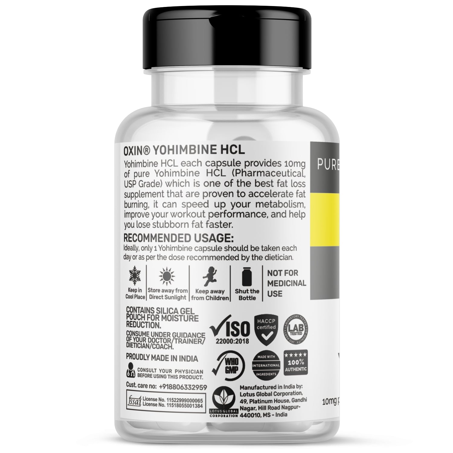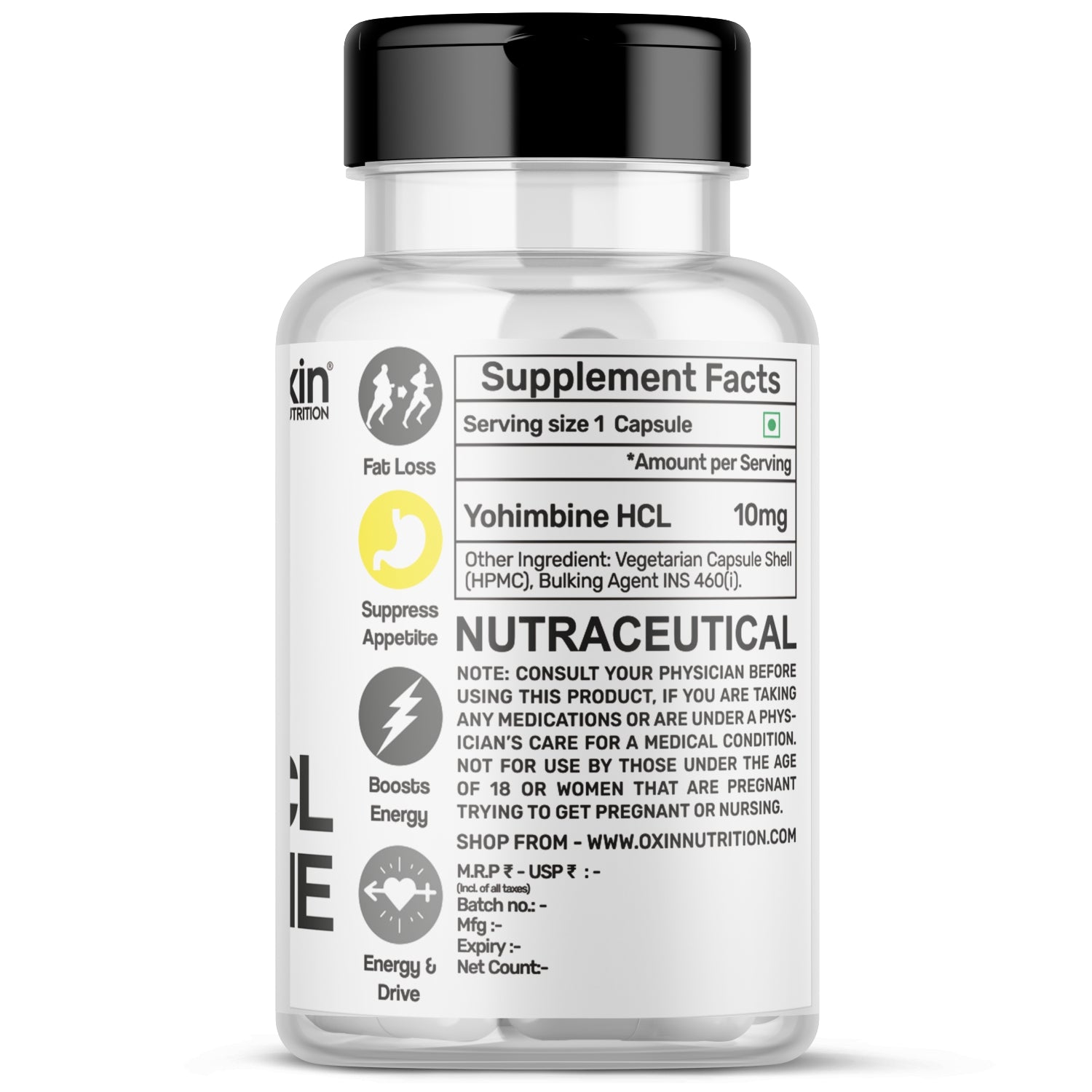 Oxin Nutrition Yohimbine HCL each capsule provides 10 mg of pure Yohimbine HCL (Pharmaceutical & USP Grade) which is one of the best fat loss supplement that are proven to accelerate fat burning, it can speed up your metabolism, improve your workout performance, and help you lose stubborn fat faster. Oxin Nutrition Yohimbine’s main property of interest for stubborn fat burning is that it’s an alpha-2-receptor antagonist. Fat cells have different receptors that control it. Oxin Nutrition Yohimbine is an alpha-2-receptor antagonist (a2-blocker), which causes your body to increase noradrenaline production. it activates the sympathetic ‘fight-or-flight’ nervous system and increases your energy expenditure, Yohimbine affects different receptors, which gives yohimbine a few unique properties. Oxin Nutrition Yohimbine HCL is in its purest form and derived from vegetarian source and well tested in lab for purity and potency.
