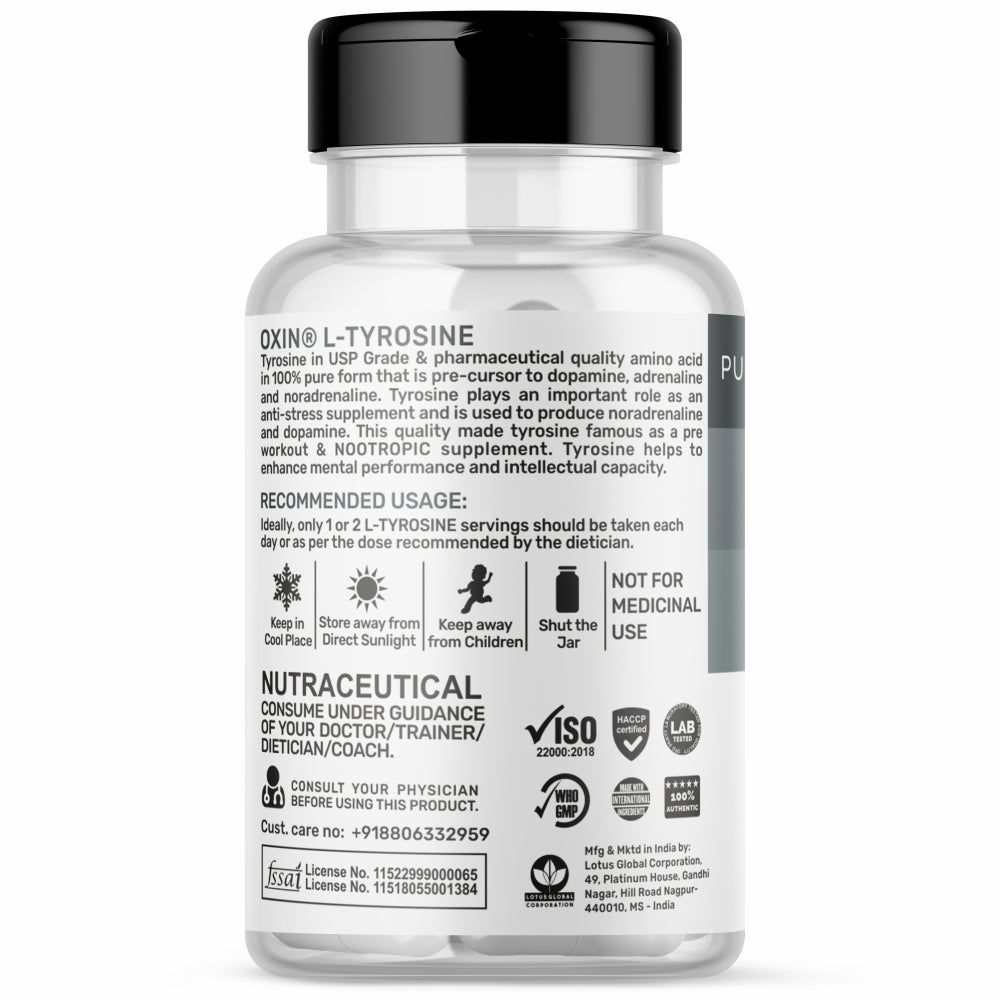 THE L-TYROSINE: Oxin Tyrosine in USP Grade & pharmaceutical quality amino acid in 100% pure form that is pre-cursor to dopamine, adrenaline and noradrenaline. Tyrosine plays an important role as an anti-stress supplement and is used to produce noradrenaline and dopamine. This quality made tyrosine famous as a pre workout & NOOTROPIC supplement. Tyrosine helps to enhance mental performance and intellectual capacity.